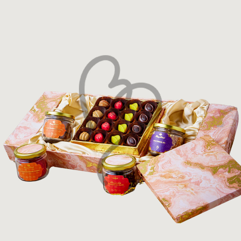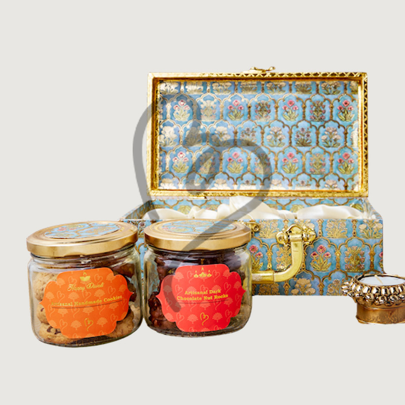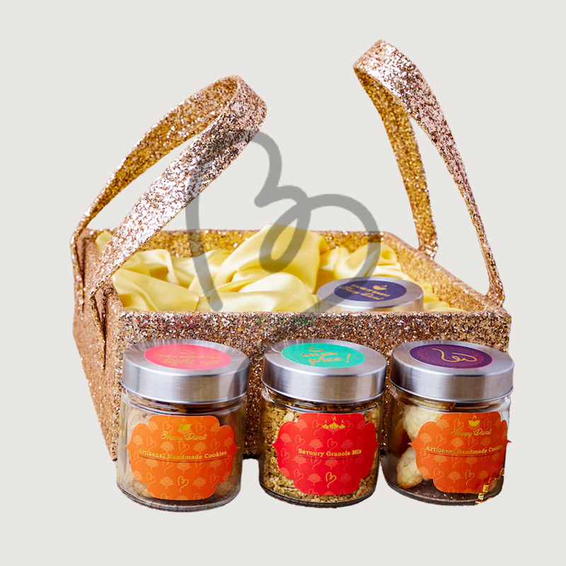 Artisanal Handmade Cookies: 1 Jar, Savoury Granola Mix: 1 Jar, Assorted Mixed Nuts: 400 gms, Elegant Diwali Diya: 1 pc, Soft-centered Chocolate, Pralines - Pack of 6